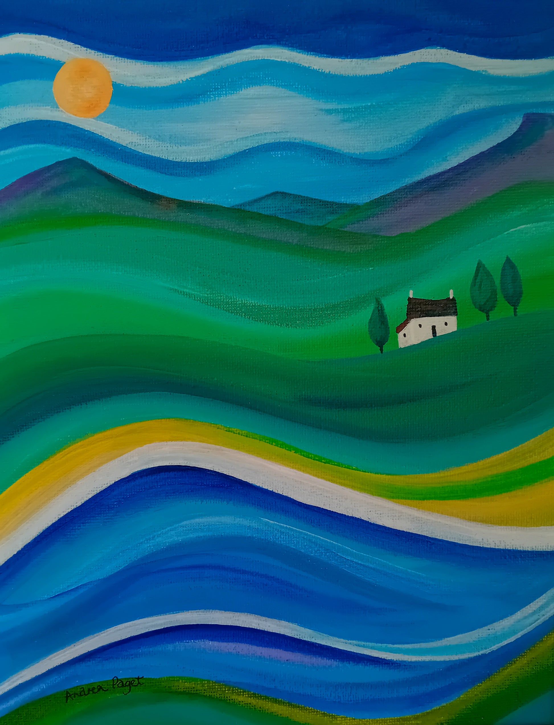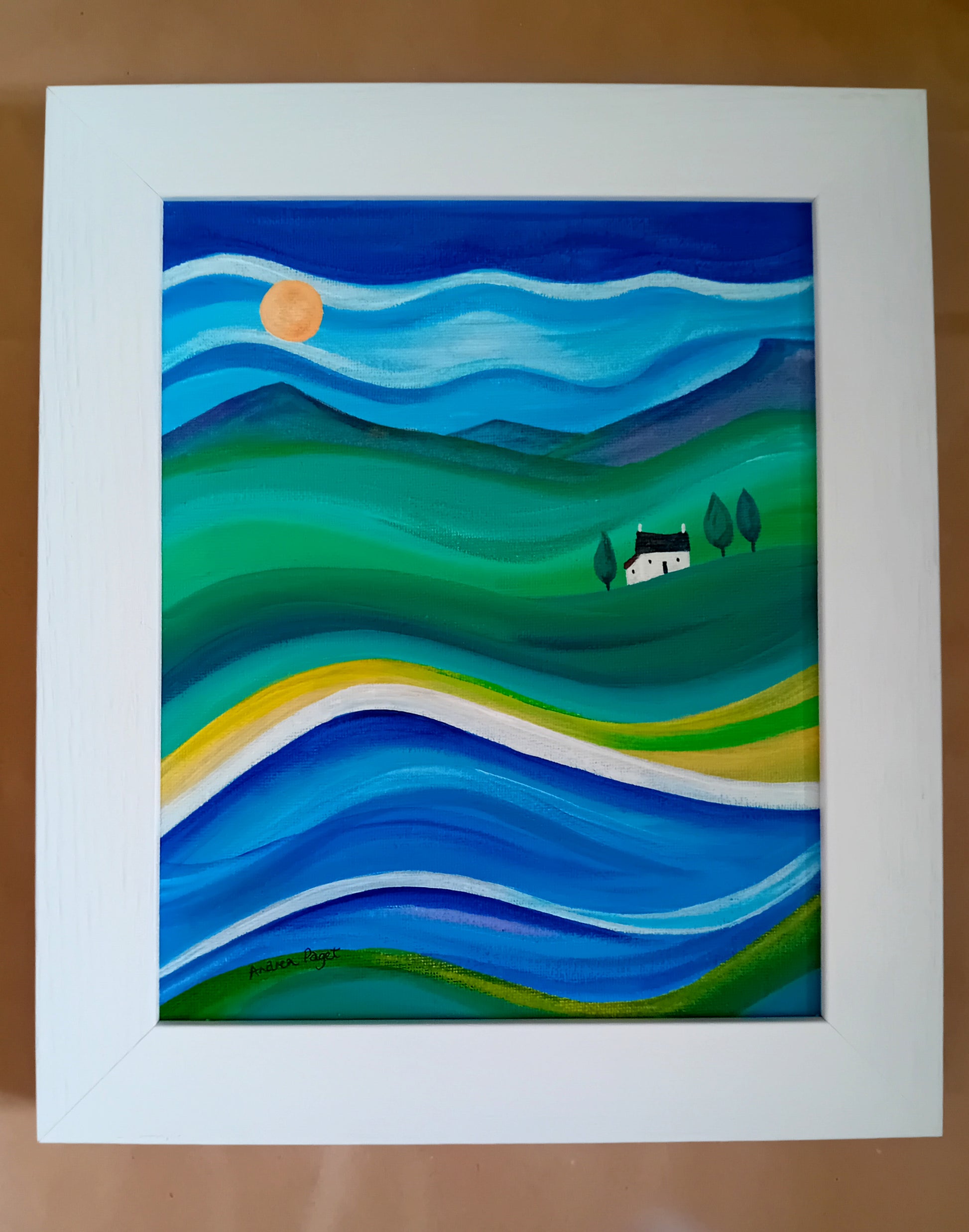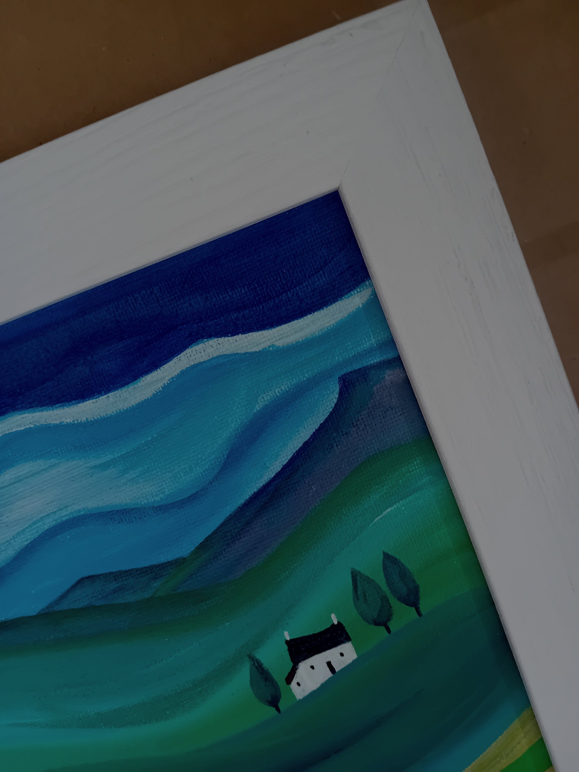 Original painting full of vibrant and sunny greens and blues to create this slightly surreal landscape. The professional white wooden framing, really sets off the colours.